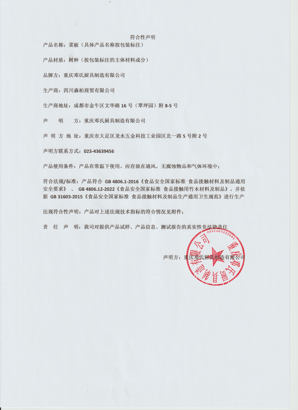 邓家刀砧板产品符合性声明